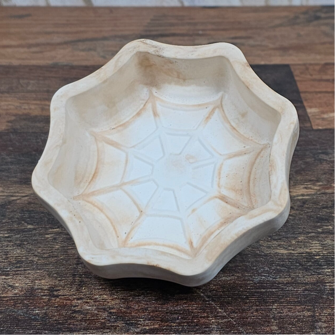 Handgefertigte Schale aus Keramikgießmasse in Form eines filigranen Spinnennetzes. Ideal als Schmuck- oder Schlüsselablage und ein dekorativer Hingucker – besonders zur Herbst- und Halloweenzeit.