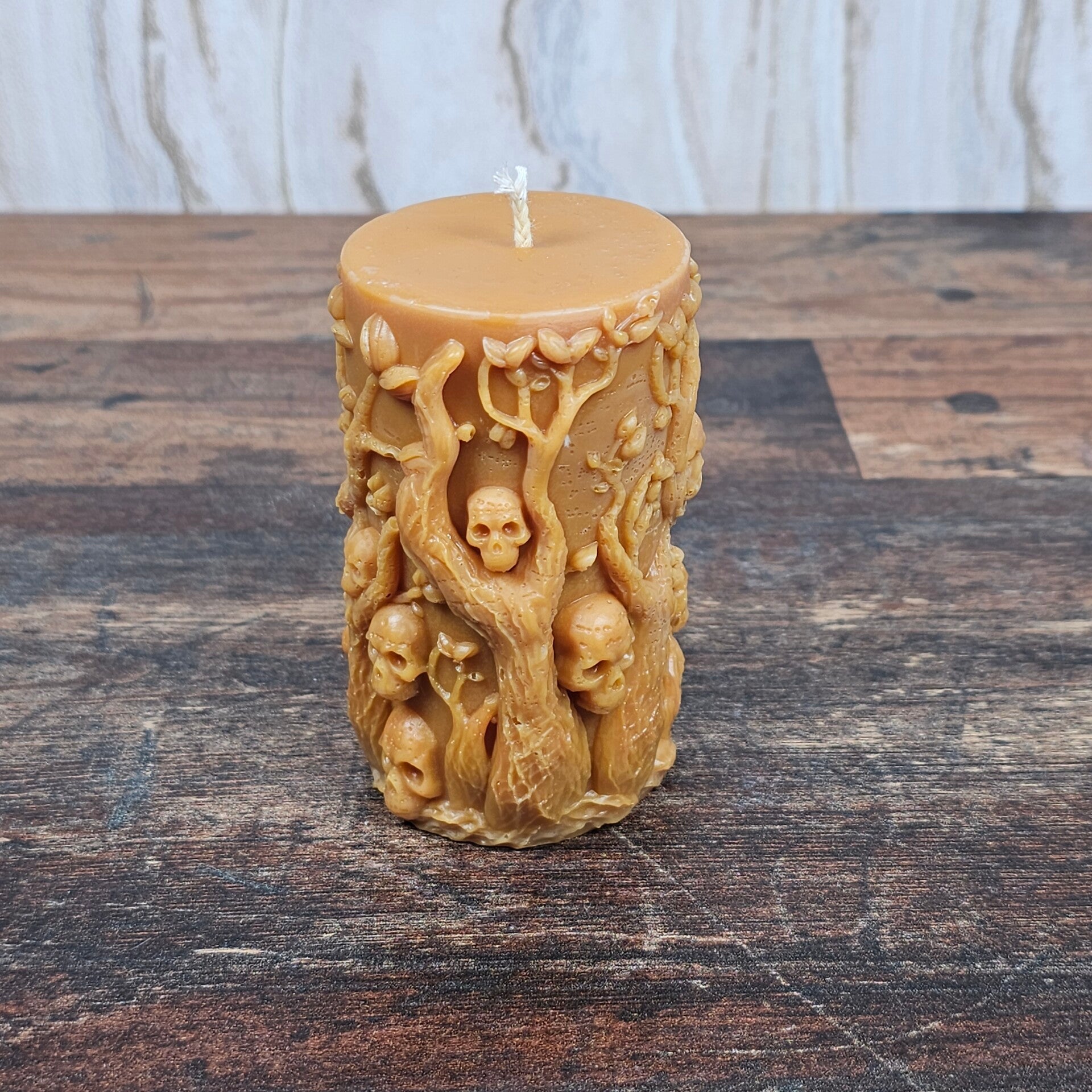 Tauche ein in die düstere Magie des Waldes: Diese detailreiche Kerze zeigt eine elegante Hexe, umgeben von Bäumen und verstreuten Totenköpfen. Perfekt für Halloween, gruselige Dekorationen oder als einzigartiges Sammlerstück für alle, die den geheimnisvollen Charme der Nacht lieben.