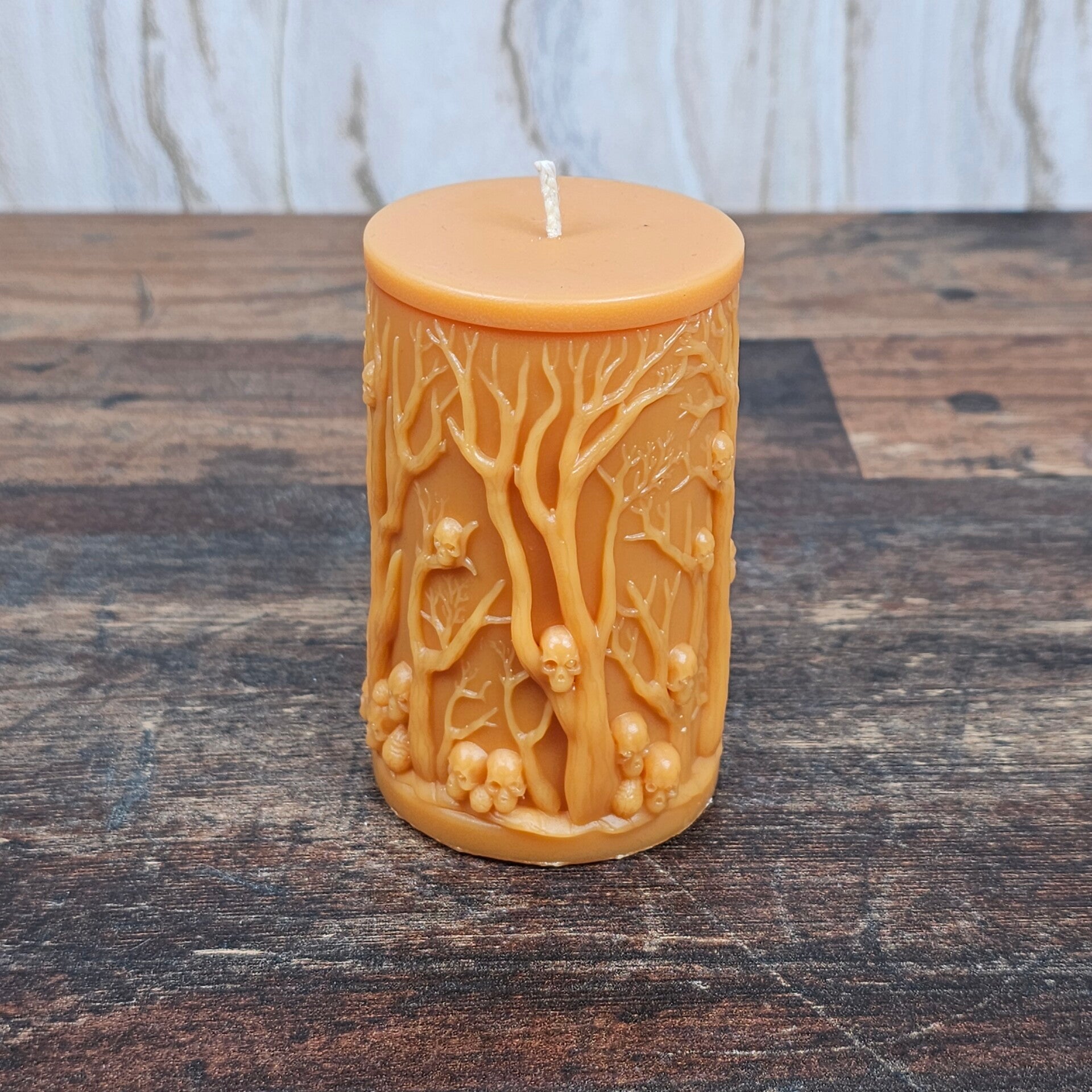 Tauche ein in die düstere Magie des Waldes: Diese detailreiche Kerze zeigt eine elegante Hexe, umgeben von Bäumen und verstreuten Totenköpfen. Perfekt für Halloween, gruselige Dekorationen oder als einzigartiges Sammlerstück für alle, die den geheimnisvollen Charme der Nacht lieben.
