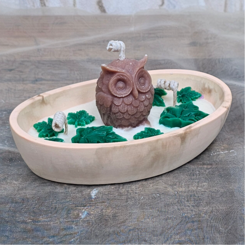 Süße Kerzenschale mit einer braunen Eule und ein paar grünen Blättern erinnert schon leicht an den Herbst.