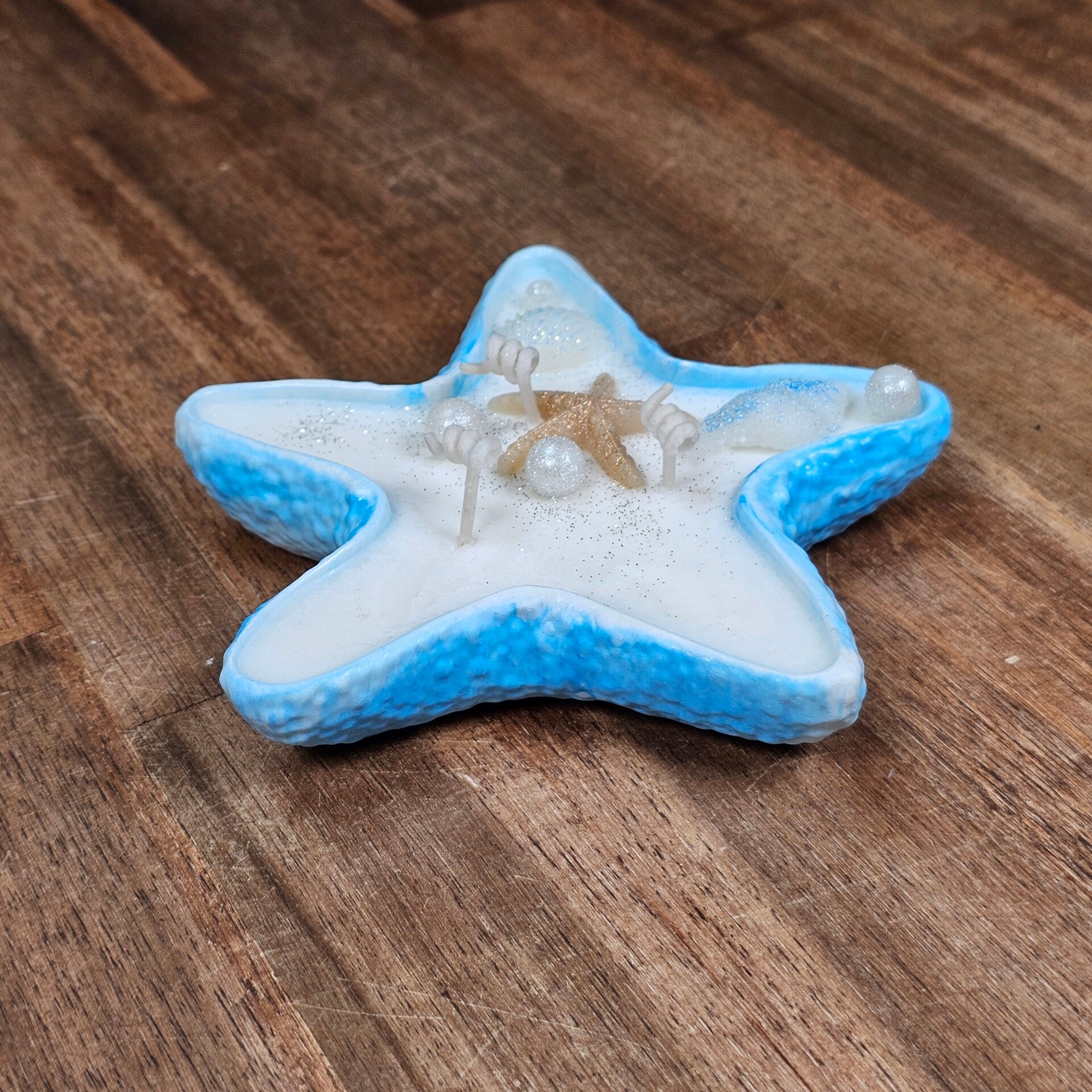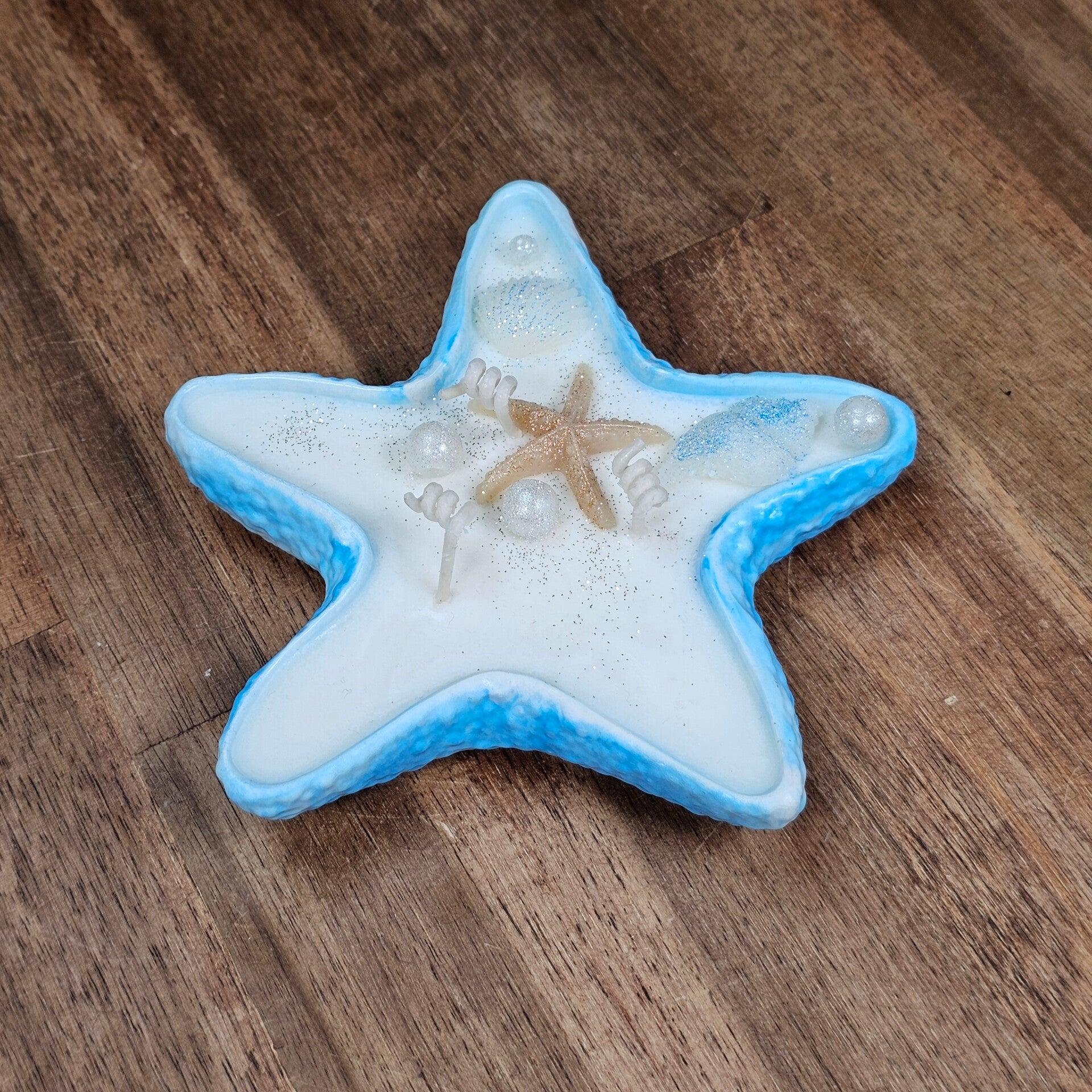 Süße Schale in Form eines Seestern gefüllt mit Wachs. Auch die Dekoration die aus Muscheln, einem Seestern und Perlen besteht ist komplett aus Wachs. Ein Hauch Bioglitzer gibt dem ganzen das letzte Finish.