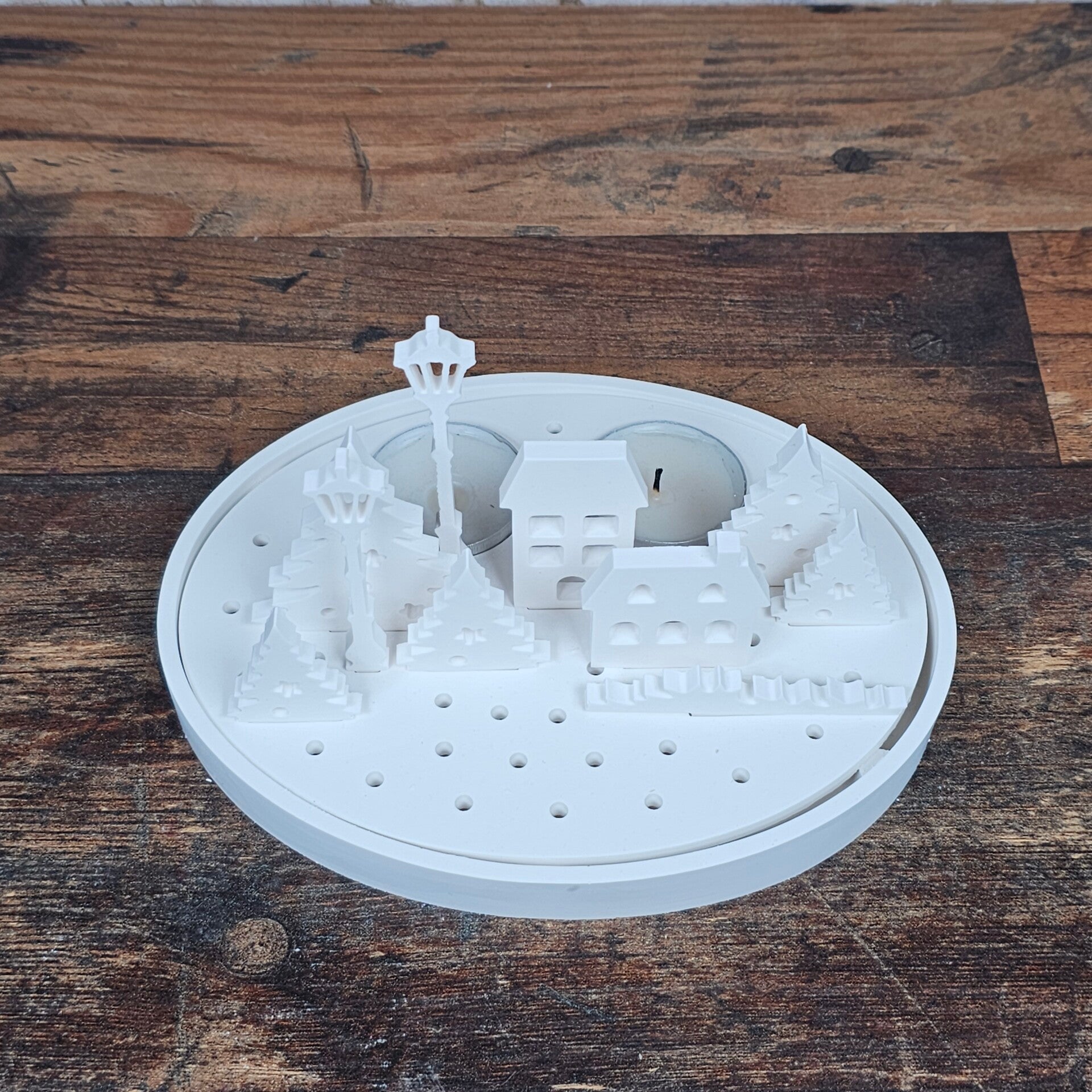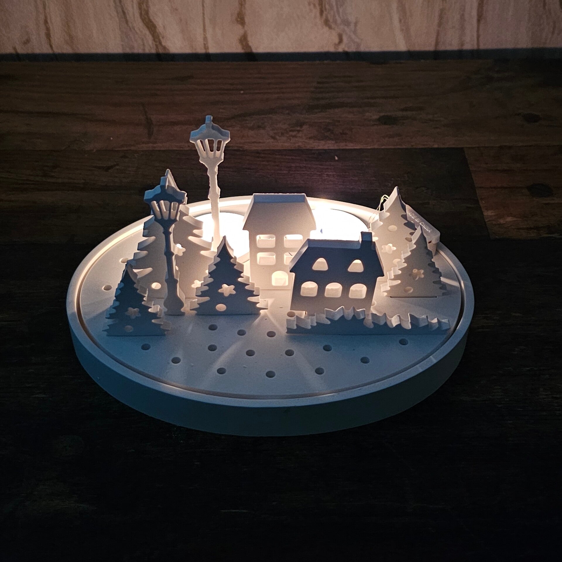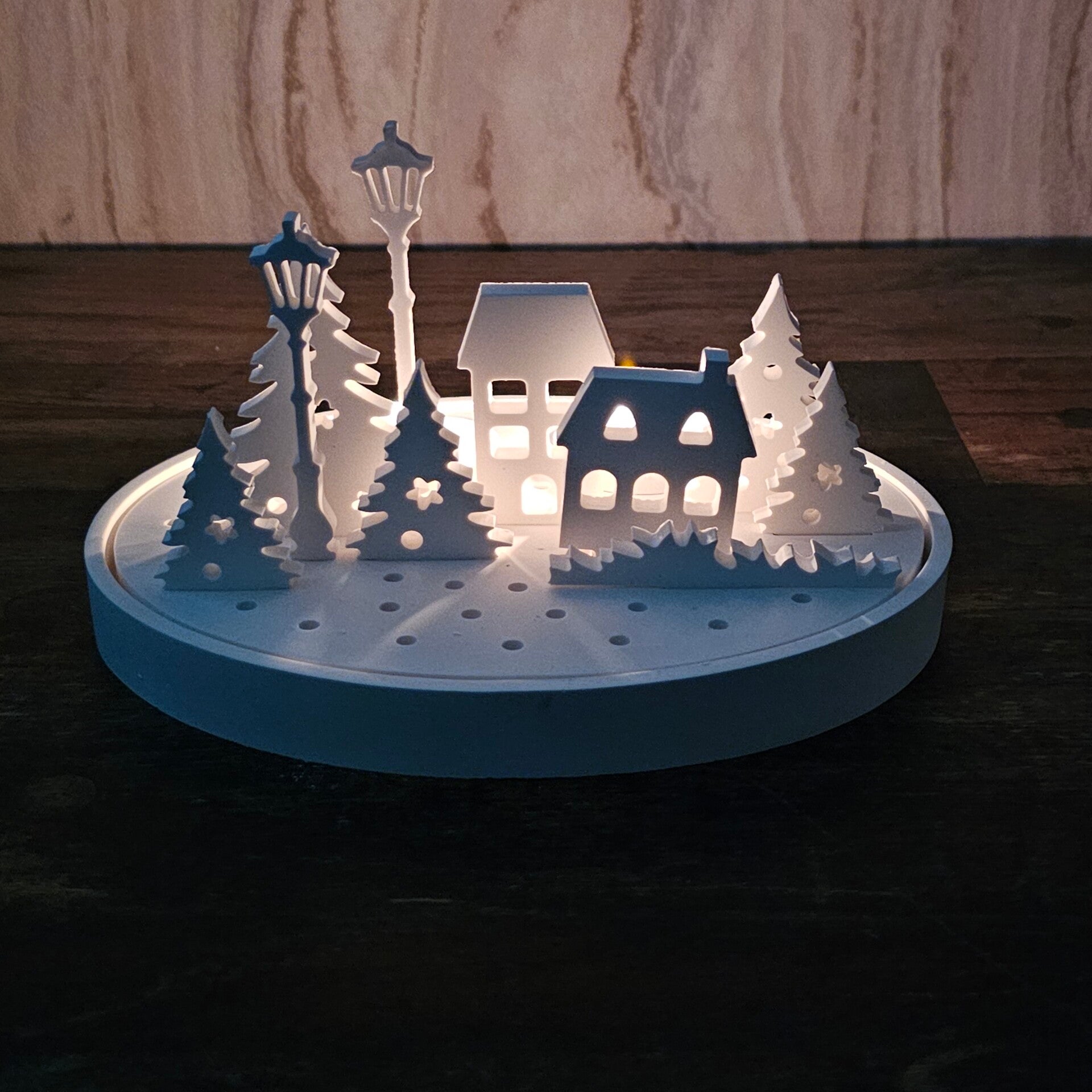 Diese einzigartige handgegossene Plattform ist die perfekte Basis für eine kleine, leuchtende Winterlandschaft.