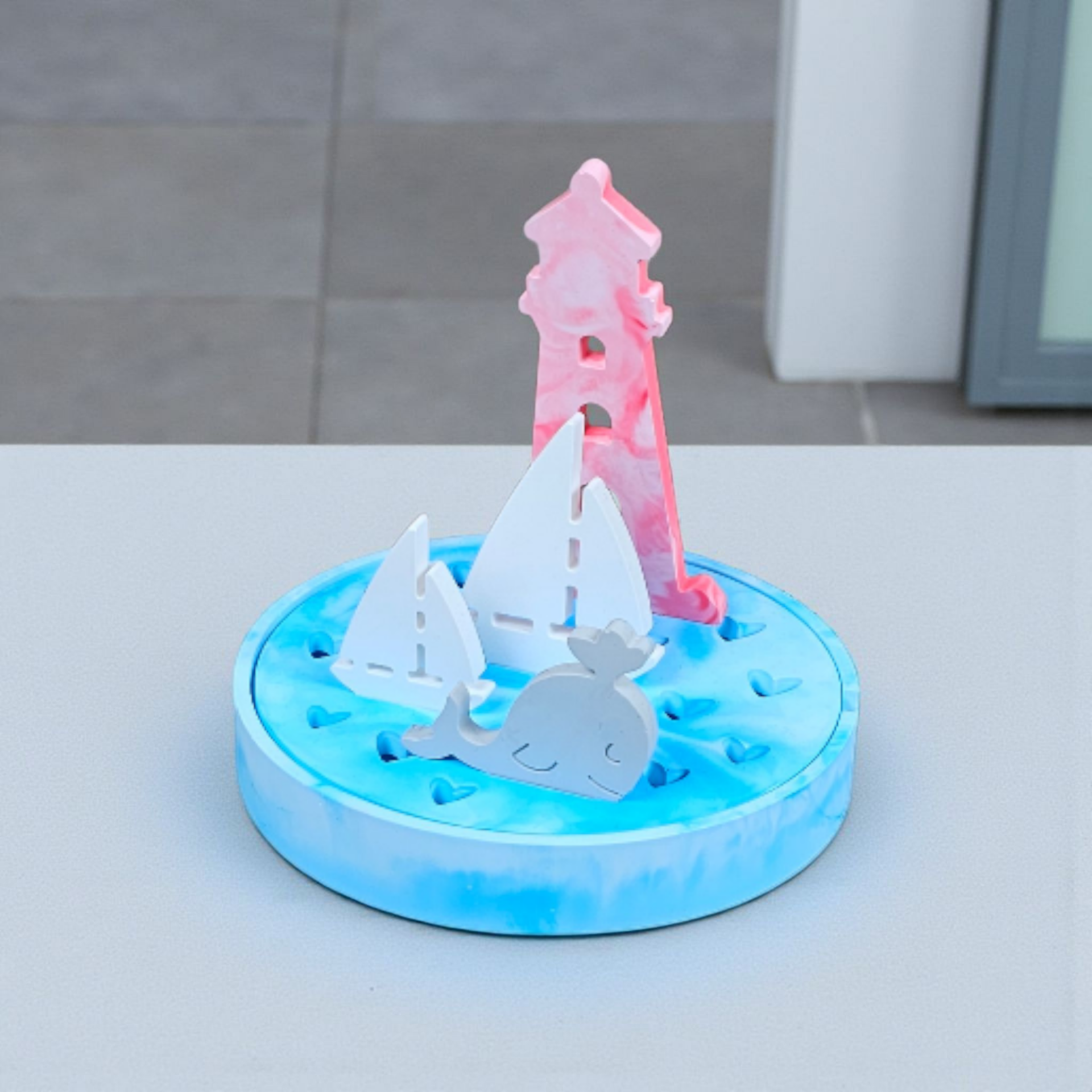 In die Schlitze lassen sich ein Leuchtturm, ein Wal und zwei Schiffe einsetzen – alle liebevoll gestaltet