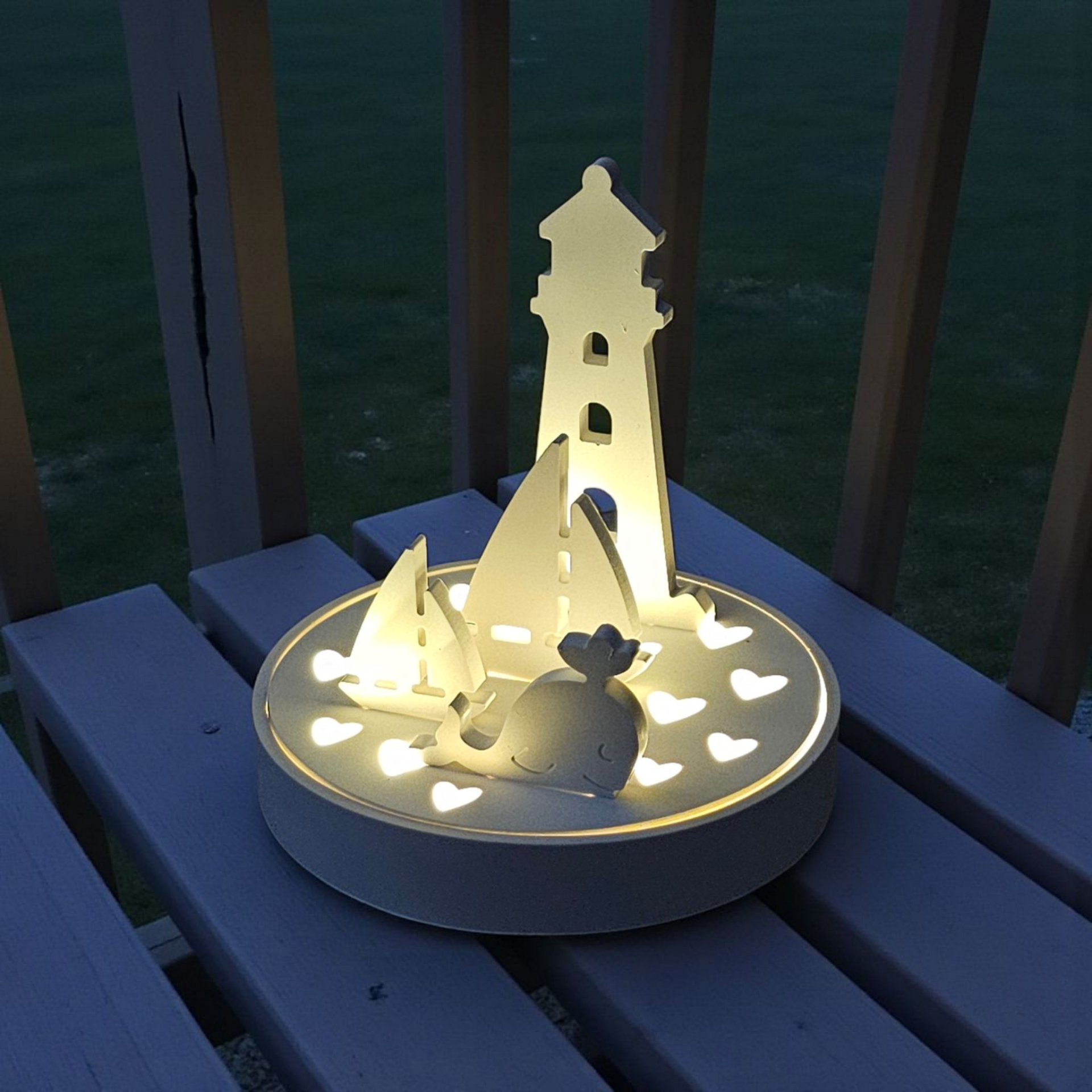 Diese handgegossene Plattform vereint maritimes Flair mit stimmungsvoller Beleuchtung und ist ein echter Blickfang für jede Deko-Ecke.
