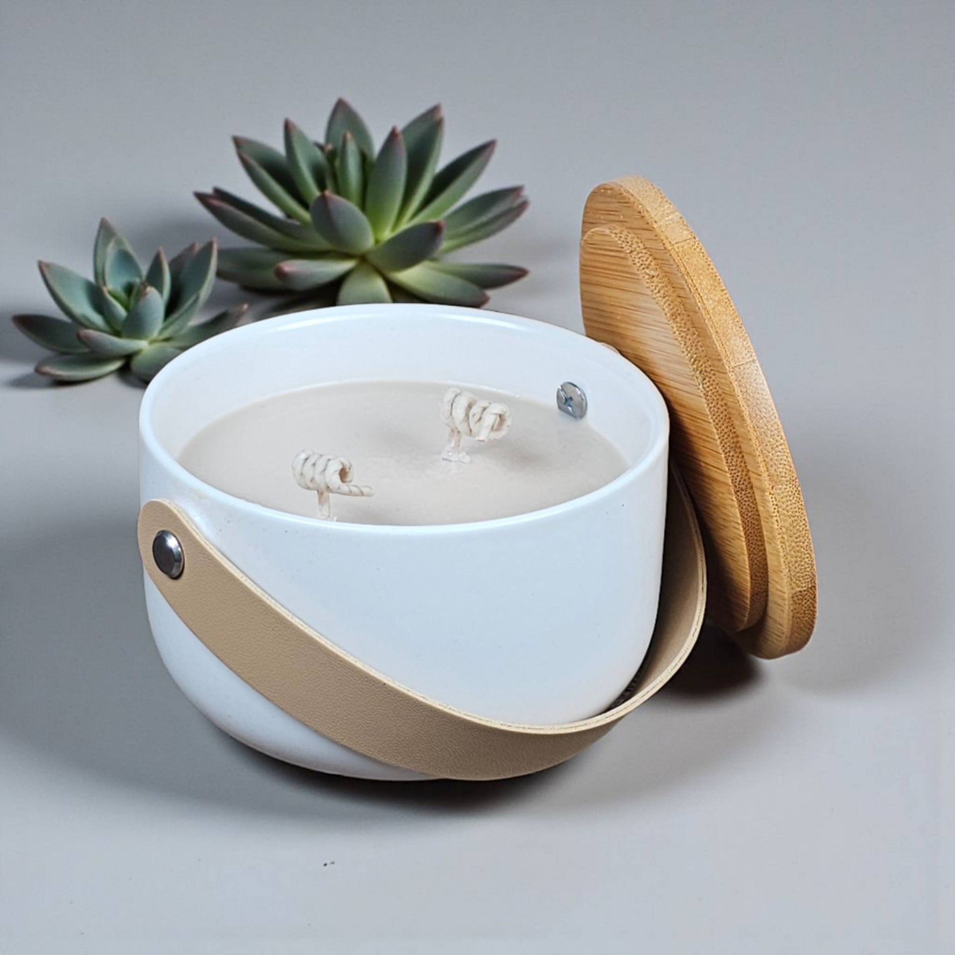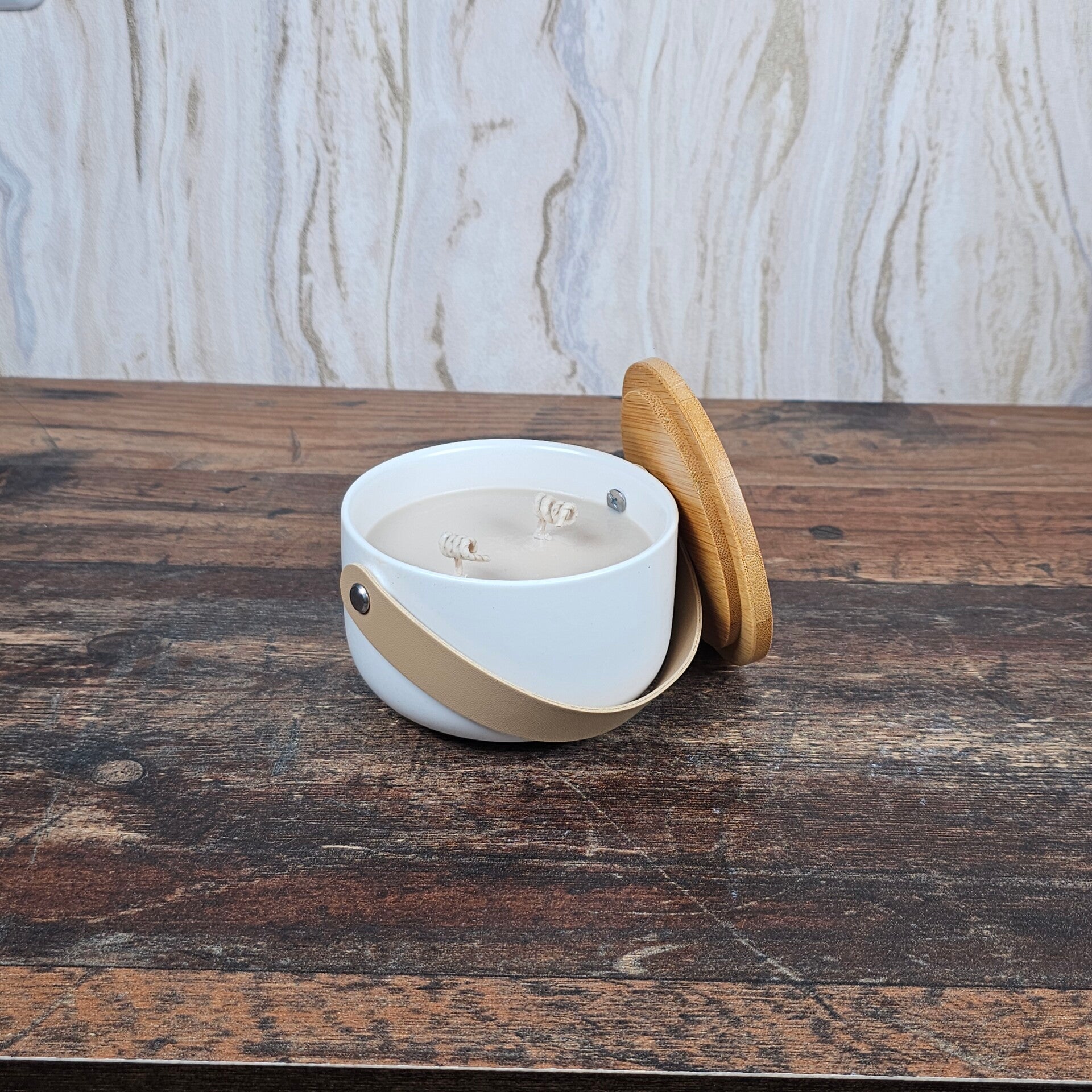Diese wunderschönen Kerzenbehälter aus Keramik in edlem creme und einem beigen Kunstlederhenkel komplett mit passendem Deckel, sind ein wahres Schmuckstück für jeden Raum. Gefüllt mit Wachs mit dem Duft deiner Wahl, lassen sie sich perfekt an deine Vorlieben anpassen. Farbige Beschriftungen setzen stilvolle Akzente, während optionaler Glitzer in Silber oder Gold den Kerzen einen Hauch von Glamour verleiht. Diese Kerzen sind nicht nur dekorativ, sondern auch eine wunderschöne Ergänzung für jeden Haushalt.